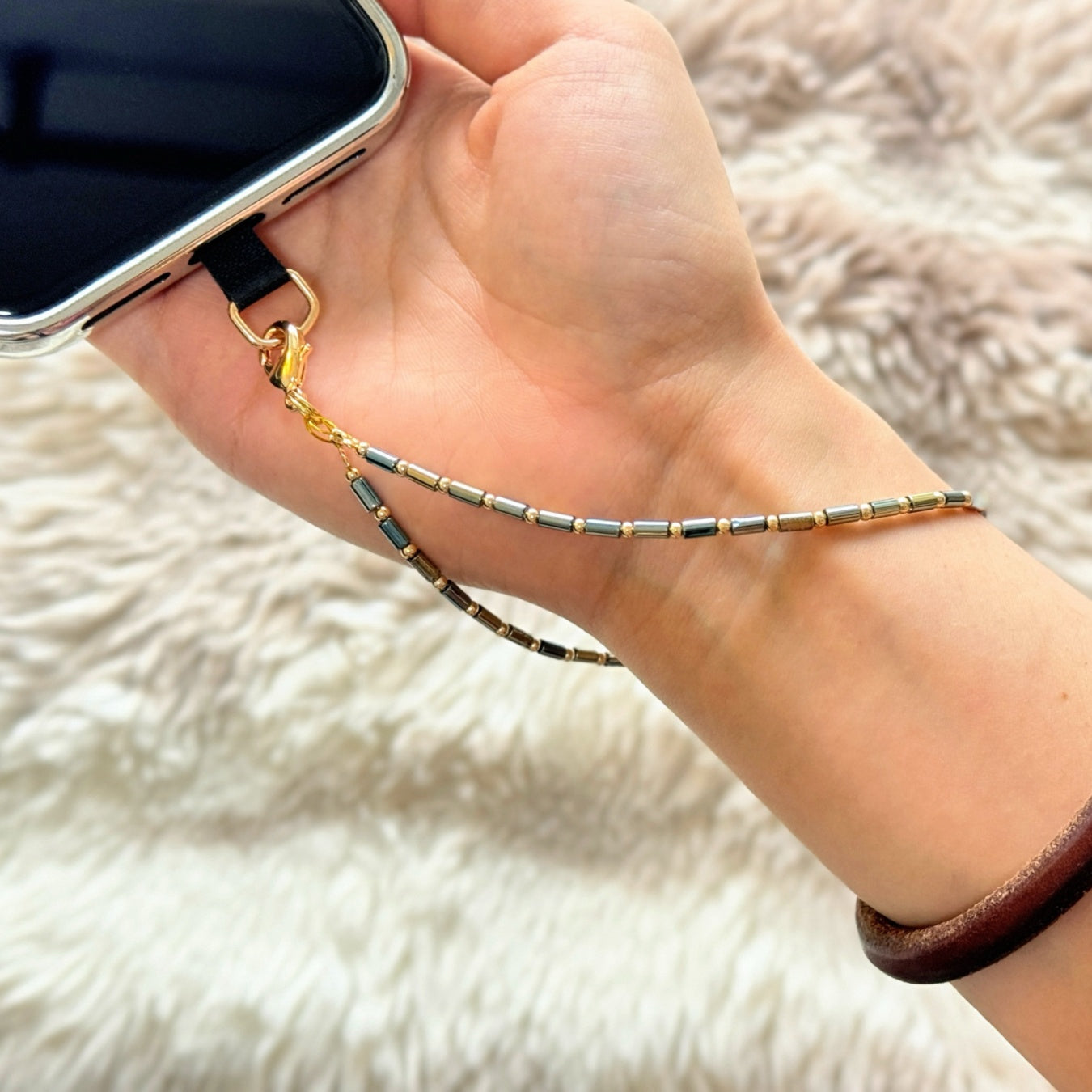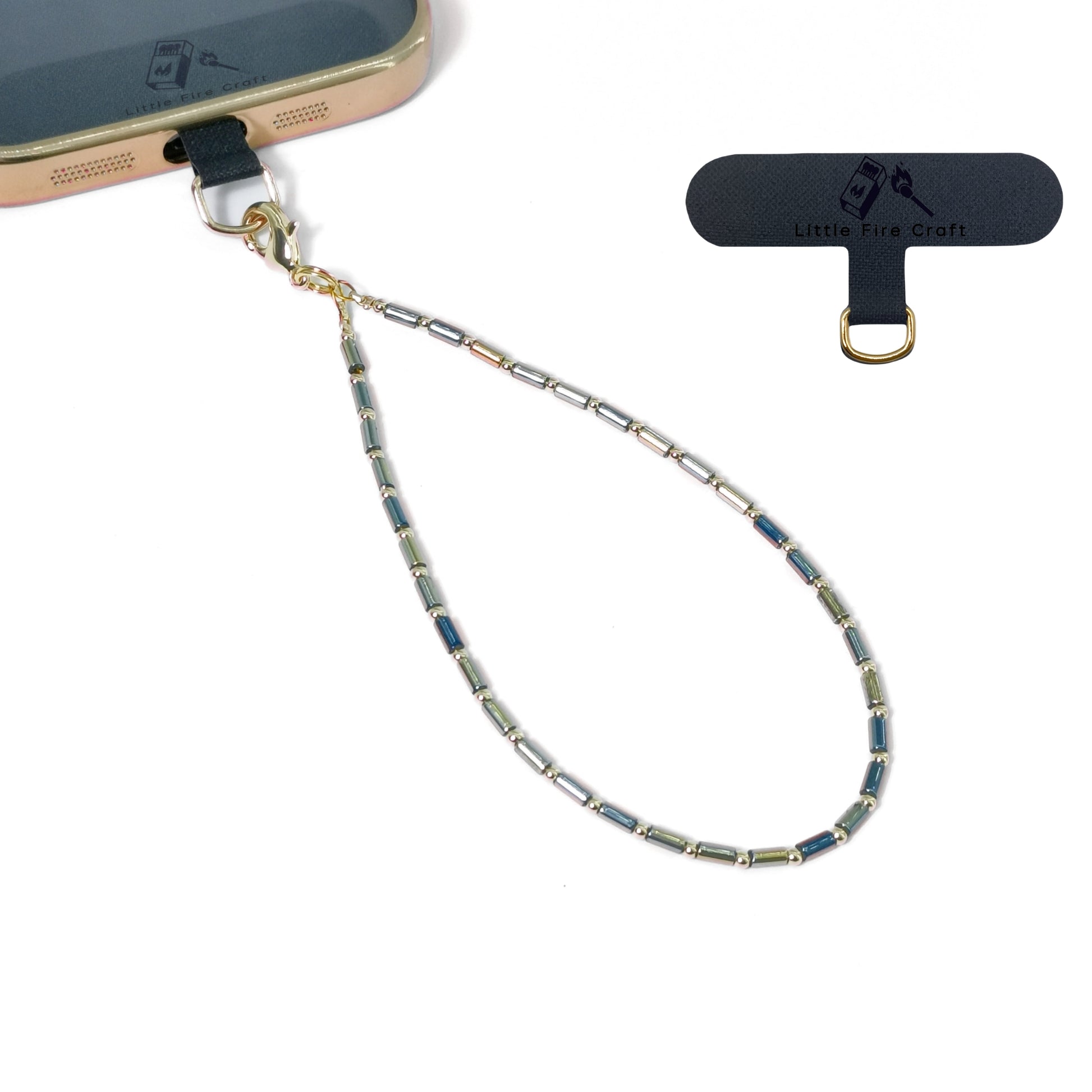 - What’s Included: Your selected phone charm, and a bonus black color phone lanyard tether tab with gold color metal ring.