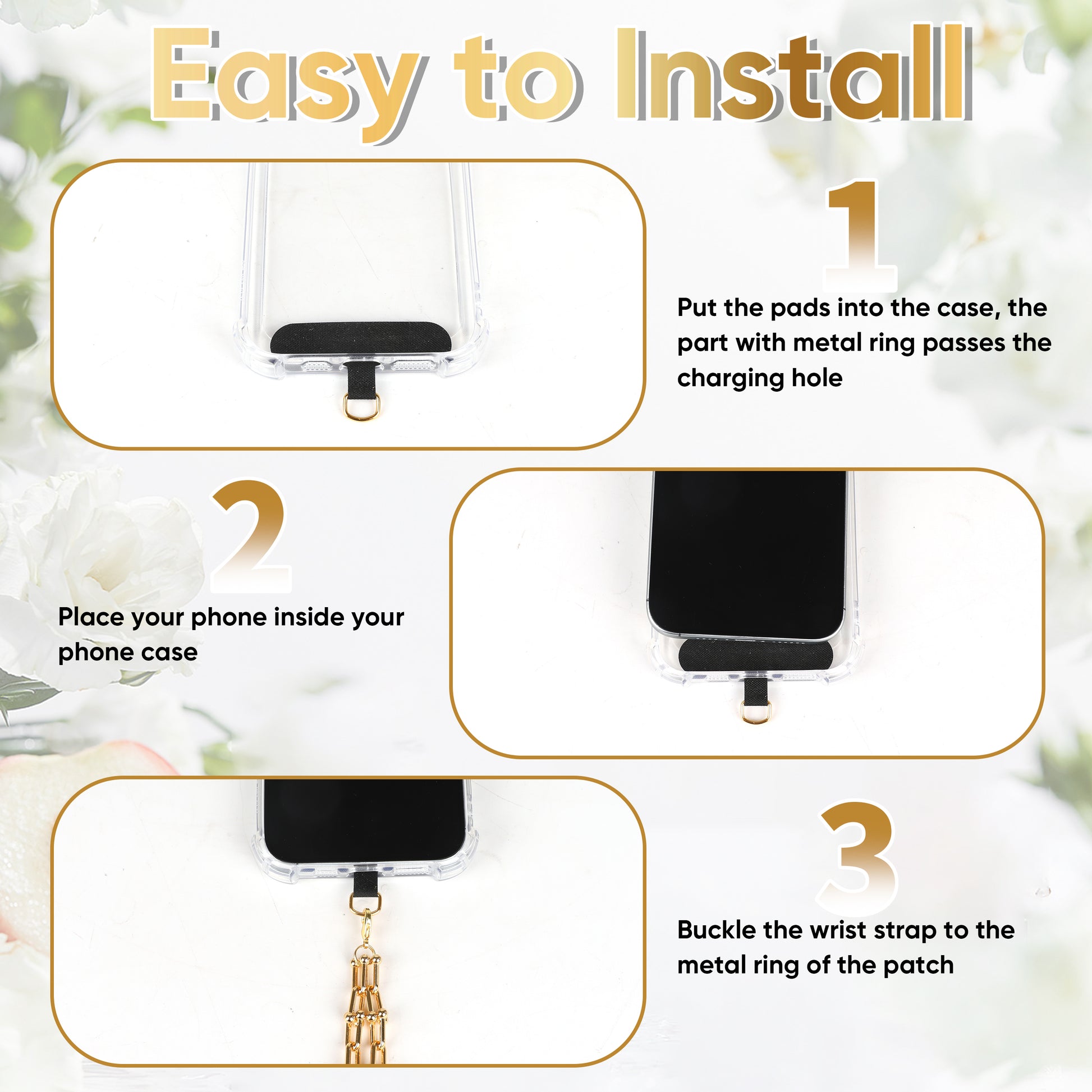 The package contains 1x metal phone wrist strap and 1x phone strap patch.