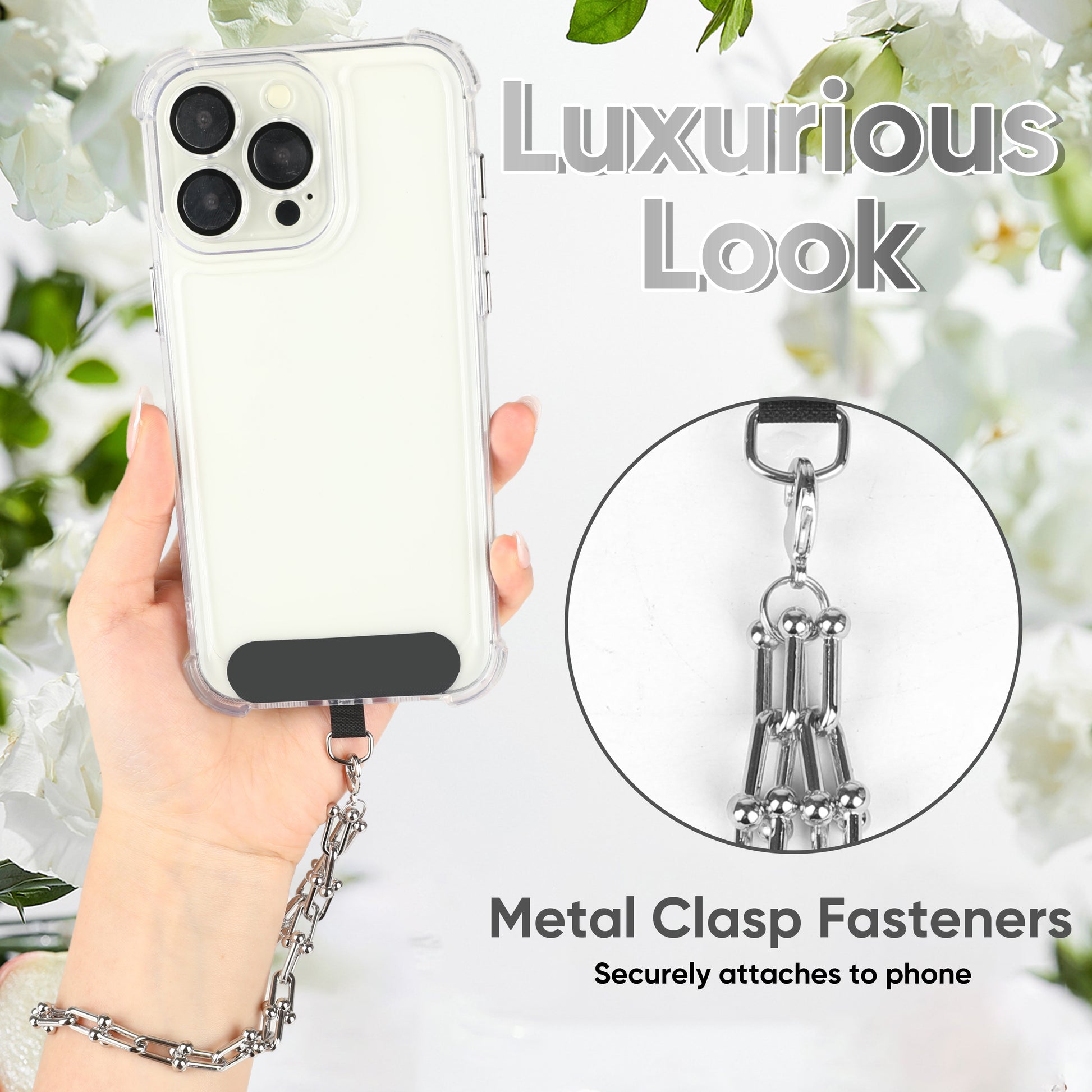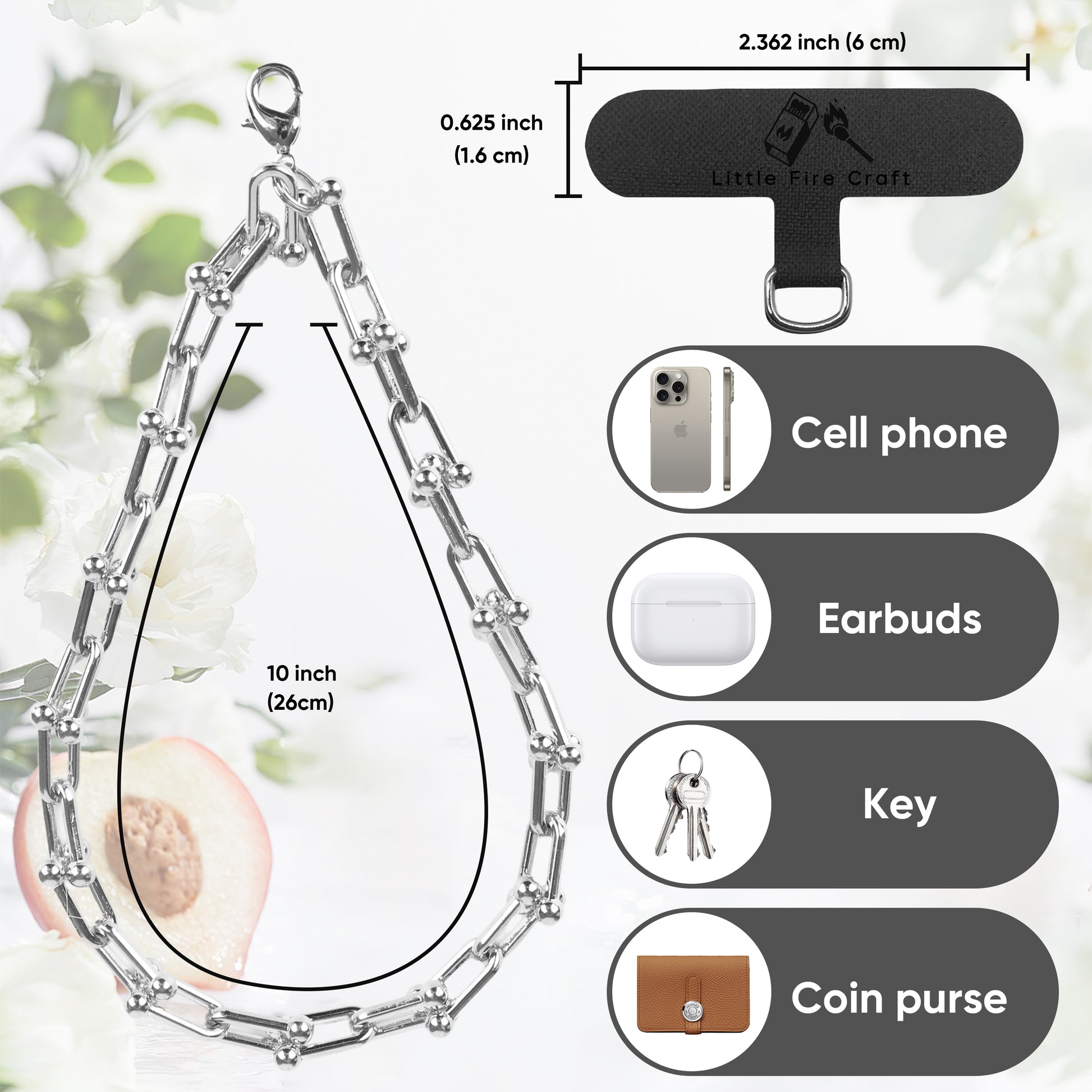 - Our phone wrist strap is sophisticated design of metal chain with an eye-catching horseshoe shaped buckle, perfect size of 10 inch (26cm) length.