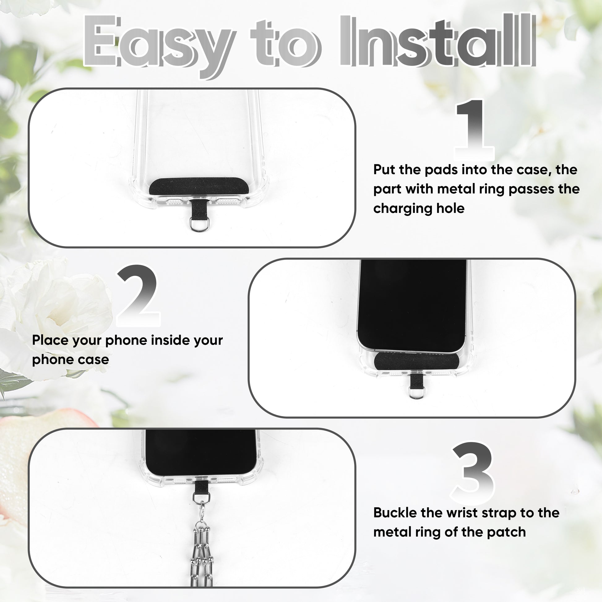 The package contains 1x metal phone wrist strap and 1x phone strap patch.
