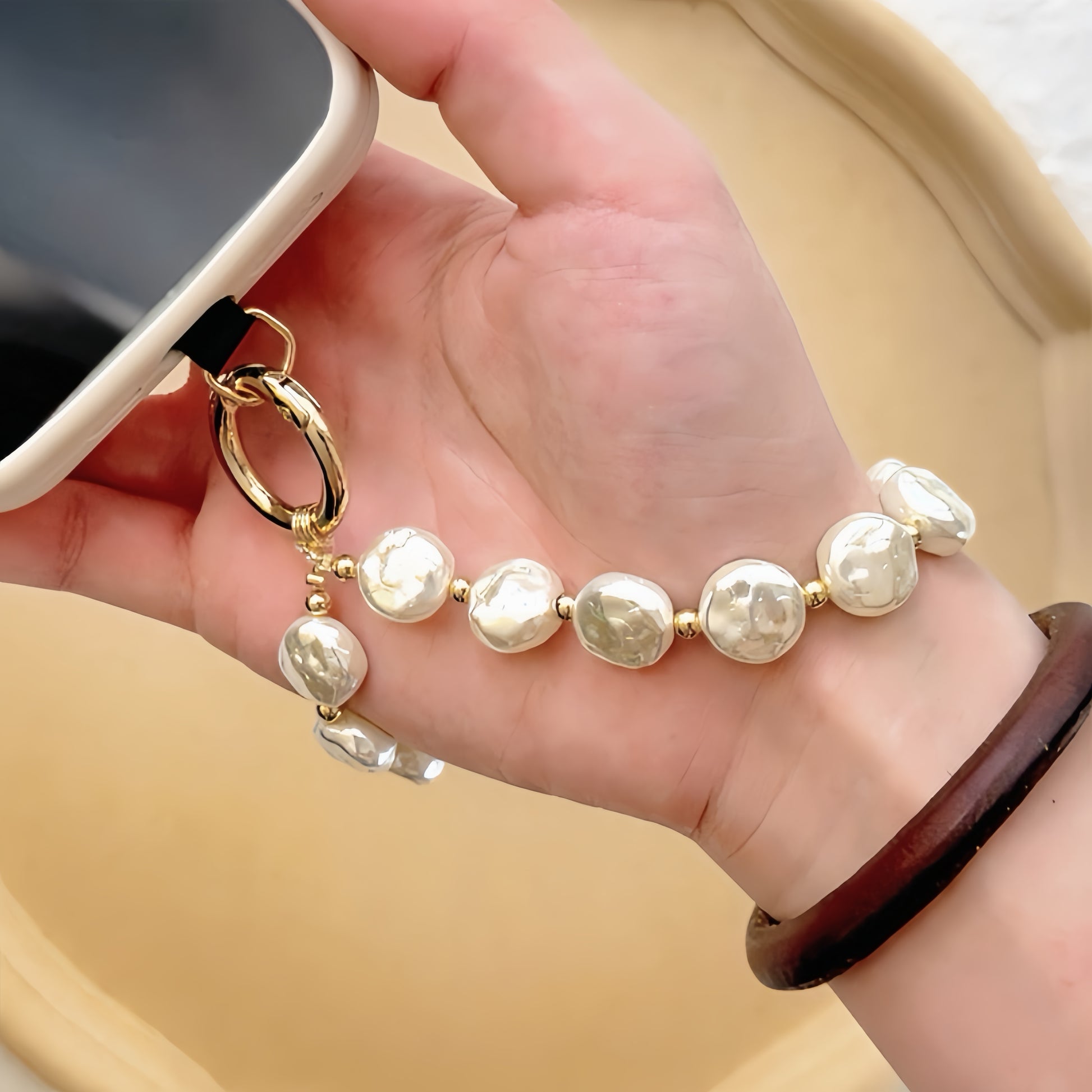 The pearl phone wristlet strap designed as a non adjustable phone wristband at an ideal 10 inches (25 cm) length, this pearl phone bracelet strap comfortably fits most wrists while securely holding your device. Please note: To ensure longevity, avoid excessive pulling or overloading weight as the phone strap strand has specific weight limitations. The fixed length provides both security and stylish convenience.
