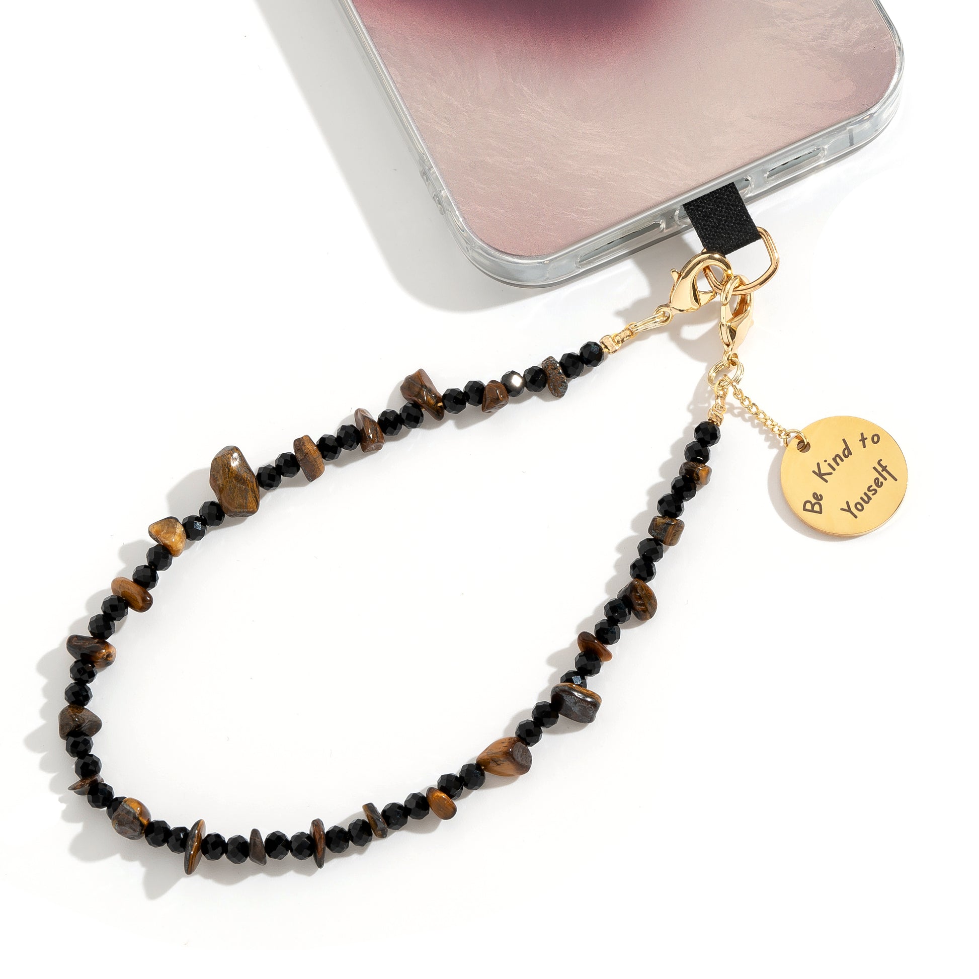 The beaded cell phone charm features metal lobster clasps on both ends for easy attachment to the included phone tether patch. It also includes a metal tag engraved with the inspiring message “Be Kind to Yourself”, encouraging positivity and self-care in everyday life, wishing people filled with more hope in the midst of a busy life.