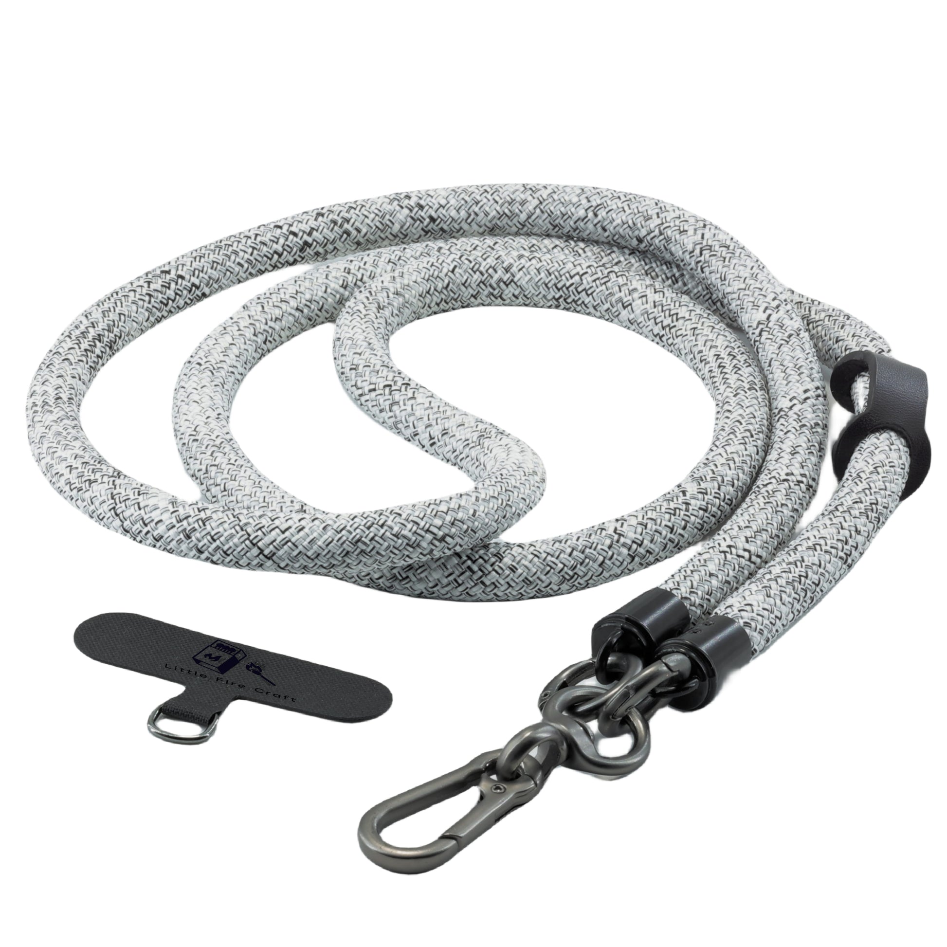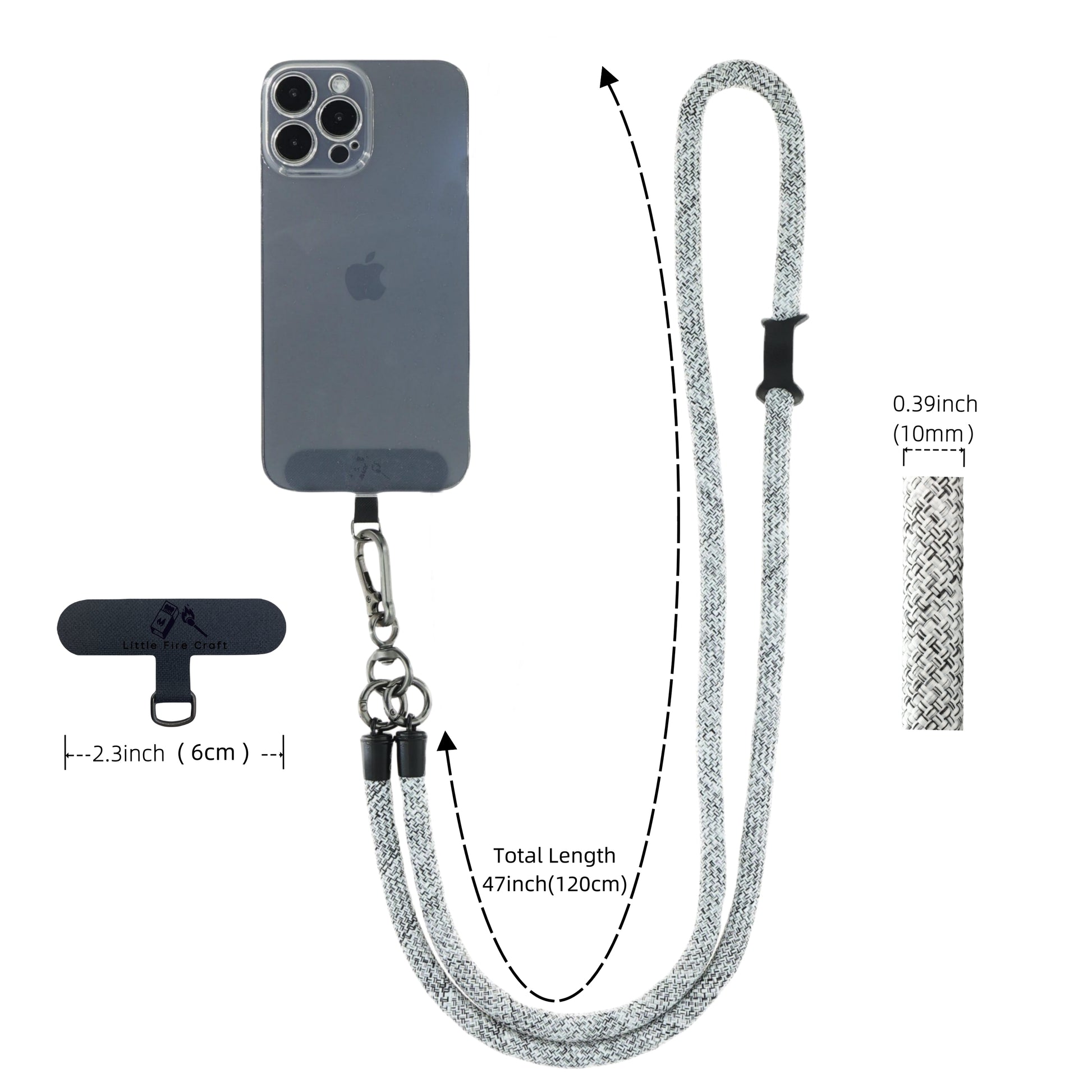 - Size Approximate 47 inch Length and 0.39 inch Thick. What's Included, 1 PC of Phone Lanyard / 1 Set of Silver Black Metal Clasp / 1 PC of Leather Buckle / 1 PC Black Cell Phone Tether Tab with Silver Black Metal Ring.
