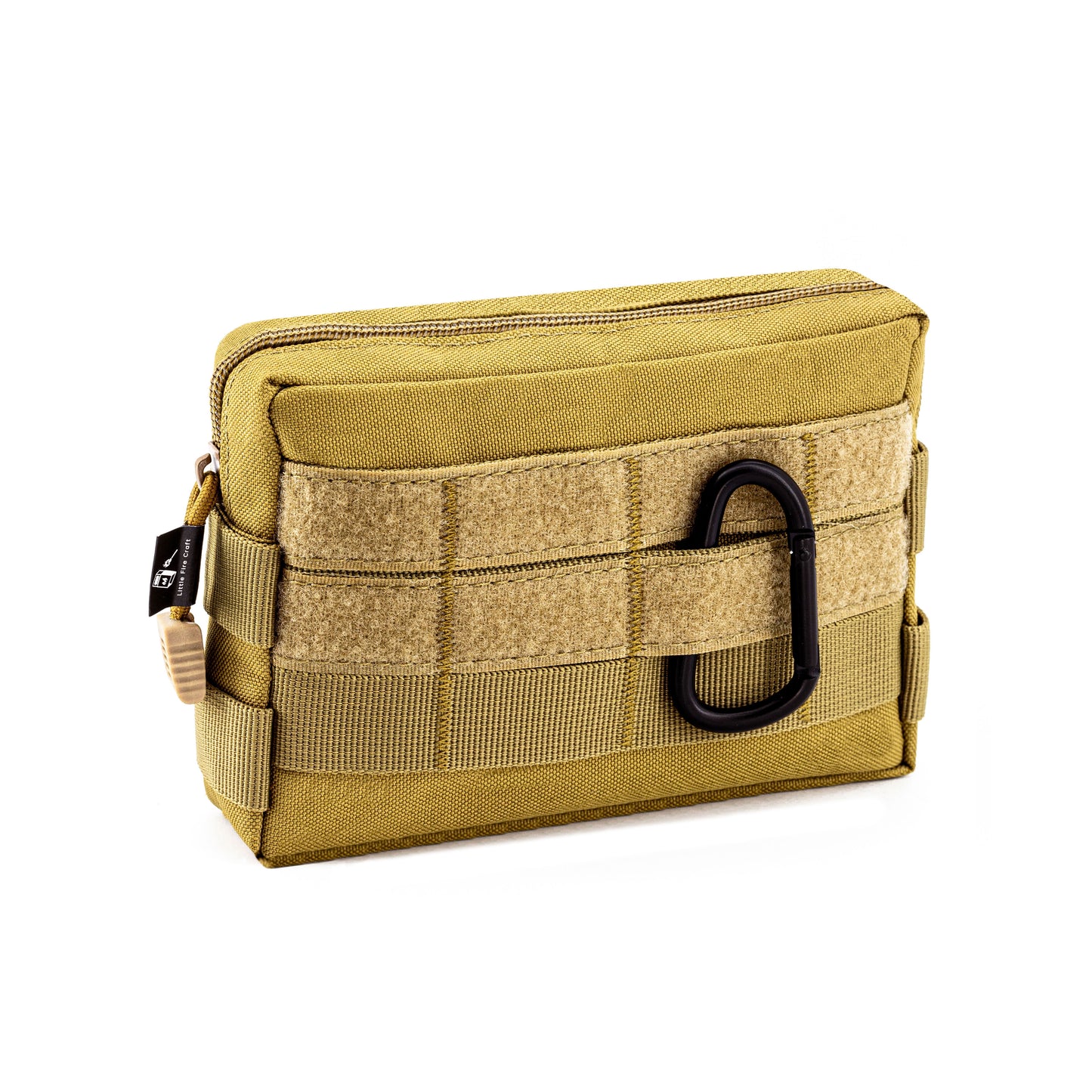 - Molle pouch with zipper, one compartment inside, double webbing straps on the back, and Velcro design on the front.